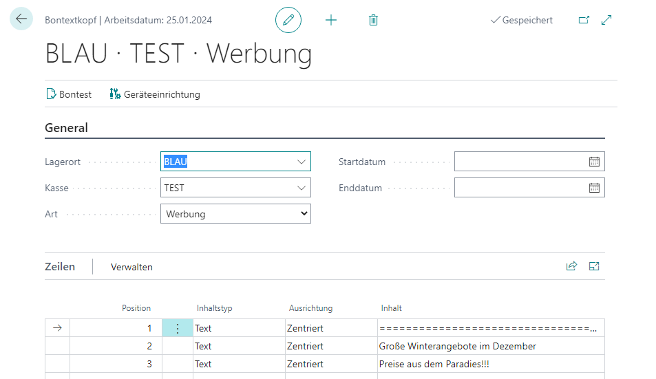 | Enddatum | Gibt das Datum an, bis zu dem die Textzeile angedruckt werden soll |