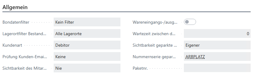 | Paketnr. | Legt fest, ob bei der Verbuchung von Artikelverkäufen/-retouren im jeweiligen Aufrag/Buchblatt standardmäßig das Feld Paketnr. mit dem vorgegebenen Wert gefüllt werden soll (Kassenkompatibilität bei aktivierter Paketnummernverfolgung) |