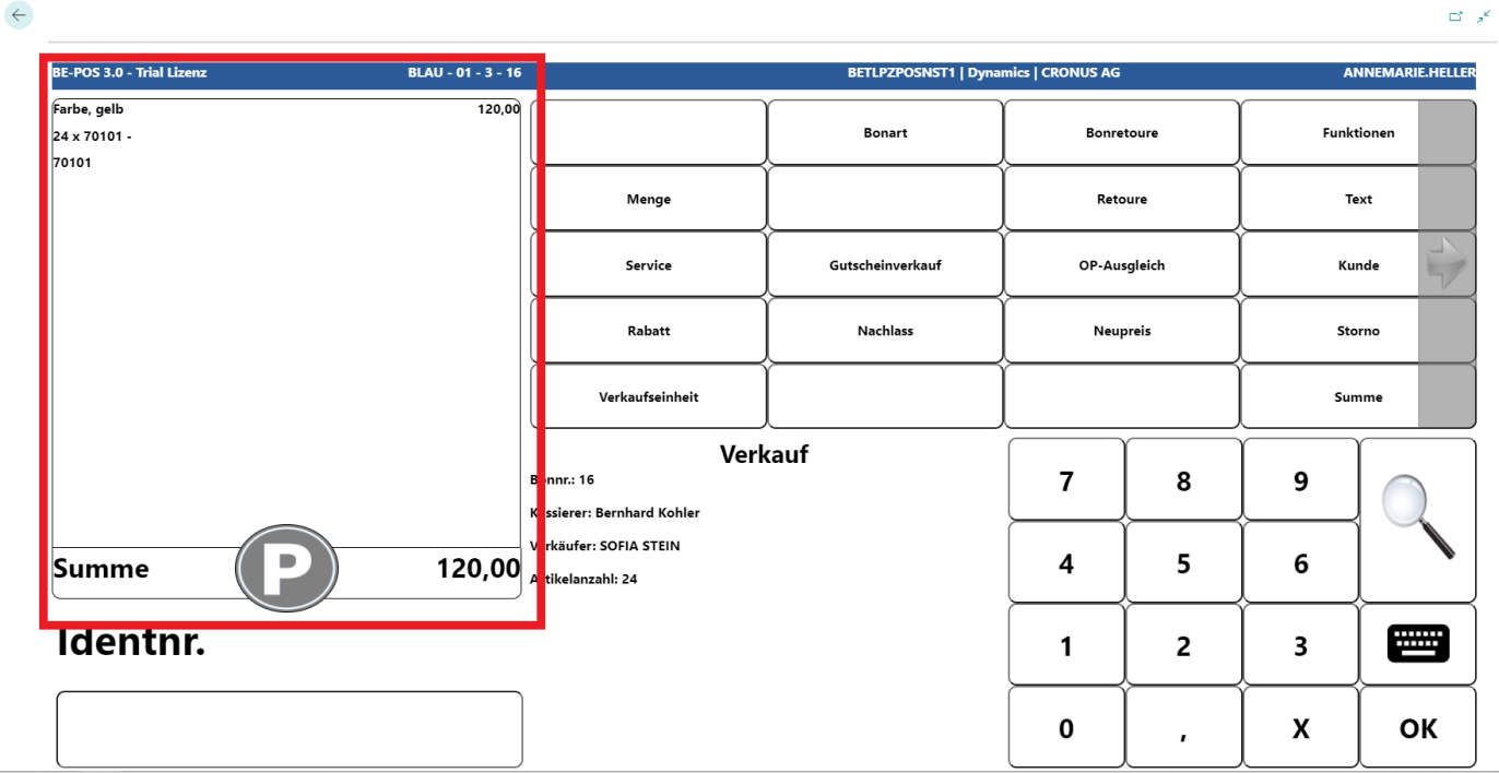 Um den Bon zurück in den Verkaufsmodus zu holen, wird erneut der P Button angewandt.