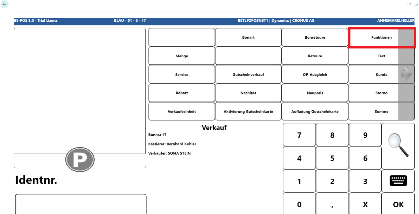 An der Kasse muss insbesondere für die Preisgruppenrabatte ein Mitarbeiter angemeldet werden. Die Registrierung des Mitarbeiters im Bon ist über die Taste Funktionen und über den Mitarbeiter-Button möglich.