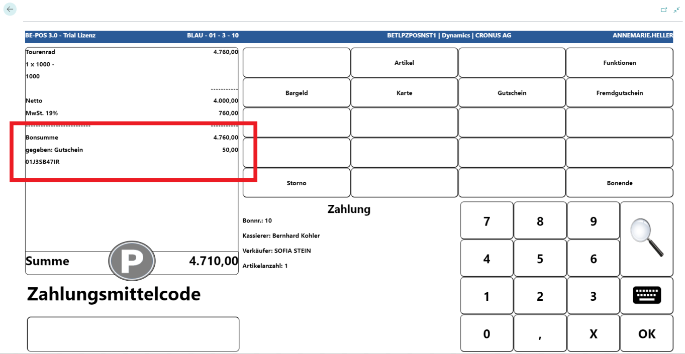 Der Gutschein wird mit dem eingegebenen Betrag in die Bonrolle übernommen.