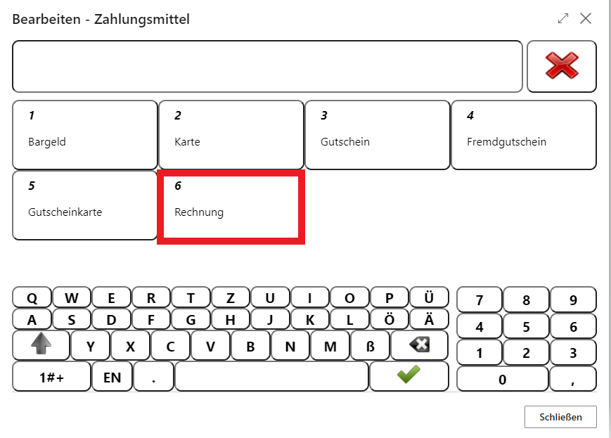Sind keine Schnelltasten für die Zahlungsmittel eingerichtet, lassen sich diese über die Lupen-Funktion aufrufen.