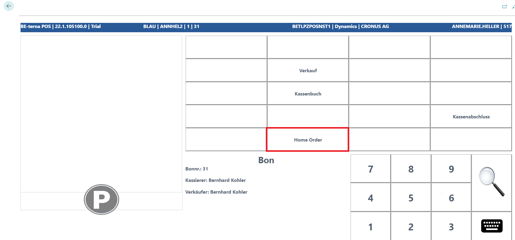 Es können dem Bon weitere Home Order-Artikel hinzugefügt werden. Die Kombination eines Verkaufs mit Home Order ist nicht möglich. Sobald alle Artikel erfasst wurden, kann der Bon per Summen-Taste bezahlt und per Bonende abgeschlossen werden.